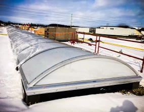 Our Acrylic Barrel Vault Continuous Skylight with Vertical Ends (commonly known as Gable Ends) is an economical choice for any large spanning curb applications. It provides an exceptional architectural look at a budgetary price. Built entirely from North American sourced, high-grade materials, this skylight is designed and built to withstand the harshest climates. This product has been tested to the highest NAFS-17 industry standards making it the first of its kind. Regardless of the size required, this model skylight can be shipped in modular sections to site and reassembled in only a few hours if required. It is comprised of an all-aluminum curb frame that has been sealed with a PVC Frost-Free thermal break profile designed for mounting on 3” (76mm) wide curbs, dual-layer UV-stabilized acrylic lenses, and heavy-duty aluminum cap frames to complete the assembly.
